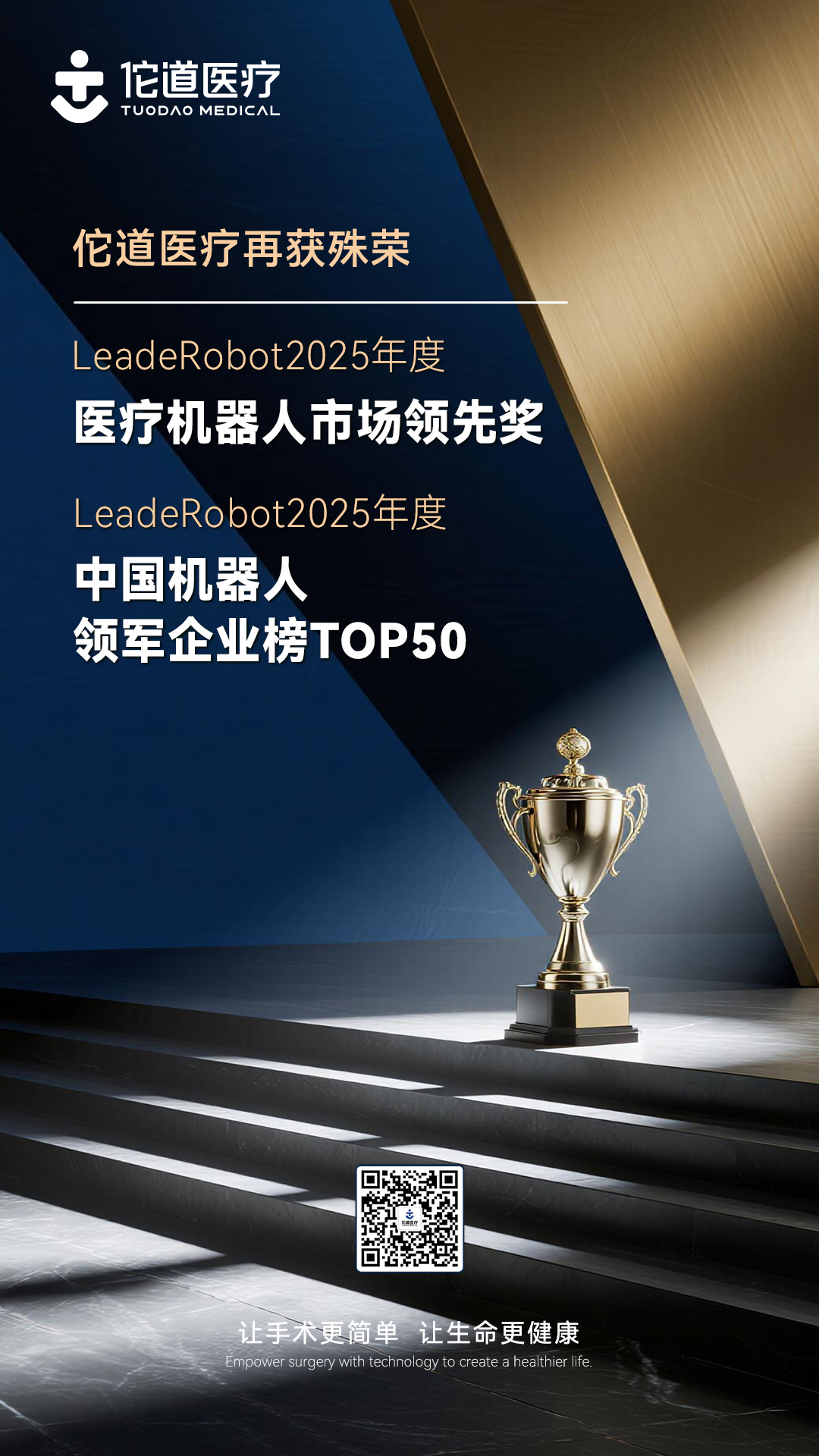 在本次盛会中,佗道医疗凭借在手术机器人领域的卓越创新与市场突破,一举斩获LeadeRobot2025年度“医疗机器人市场领先奖”,并强势登榜“中国机器人领军企业榜TOP50”,充分彰显佗道在医疗机器人赛道的标杆地位与行业引领力。